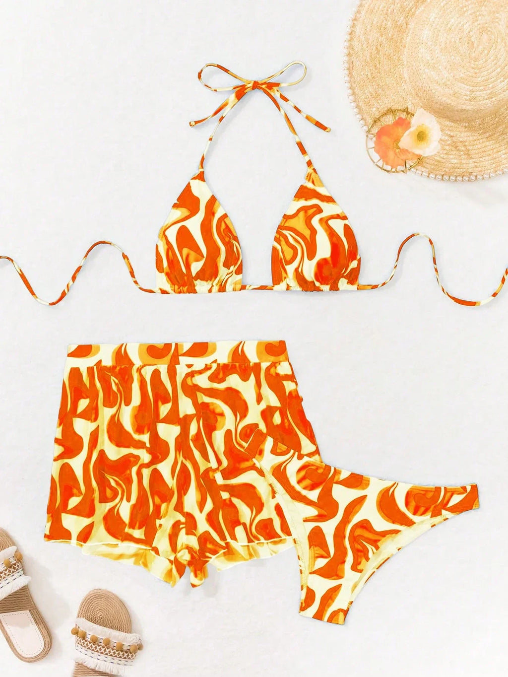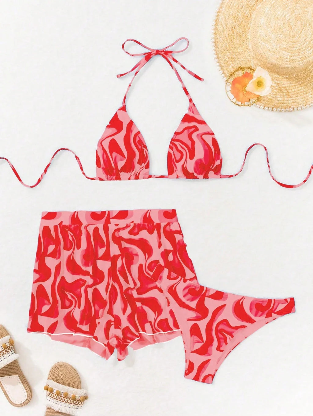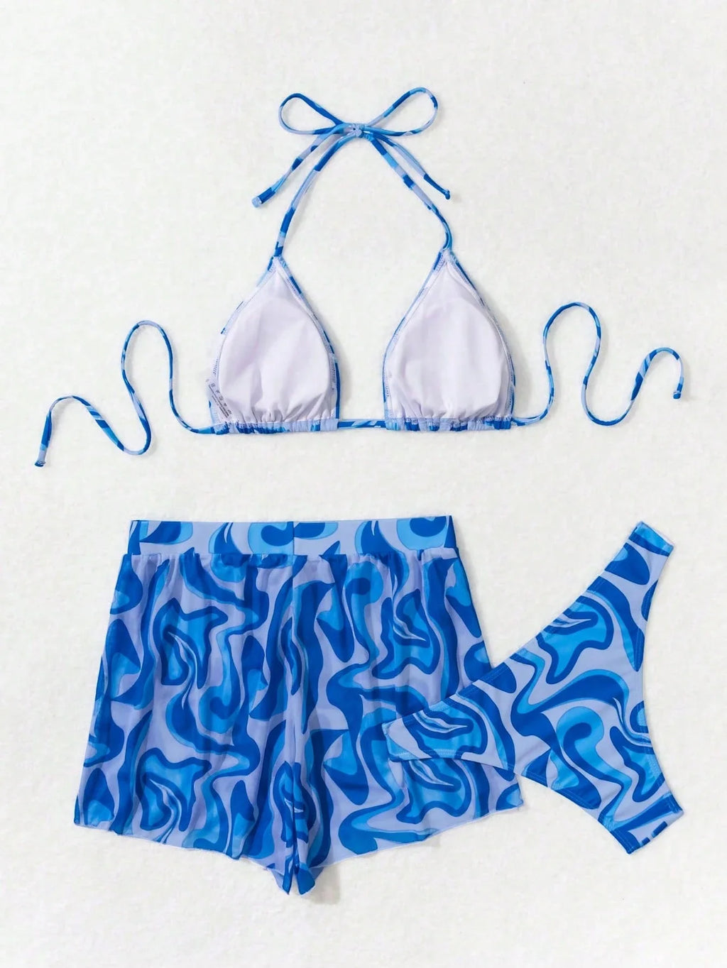 Swim Vcay 3 peças/Conjunto Maiô Bikini Impresso Aleatório para Praia/Férias