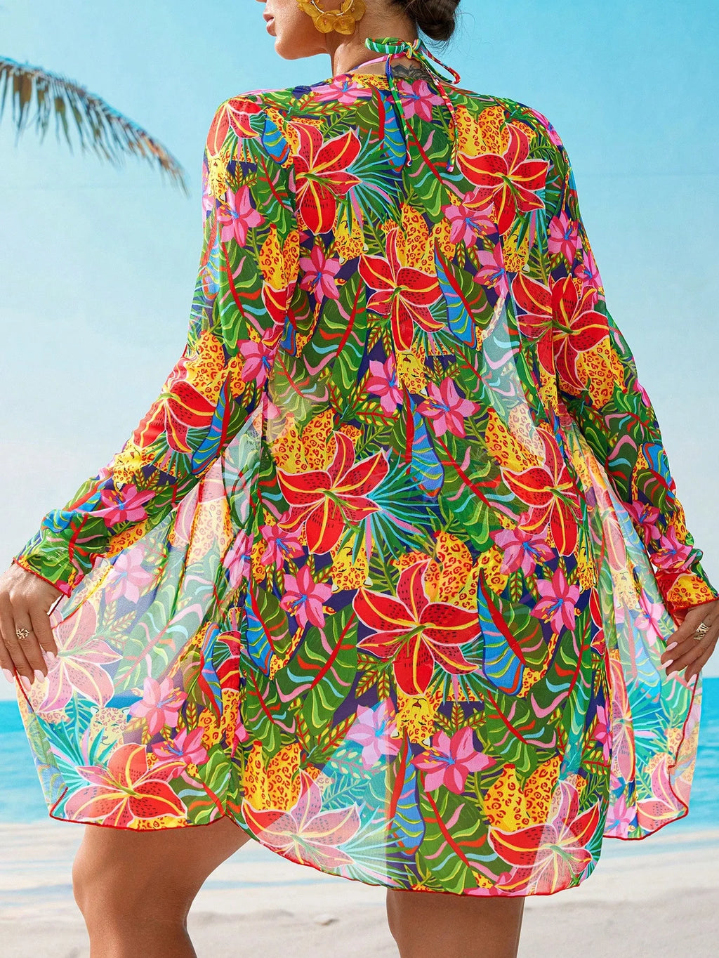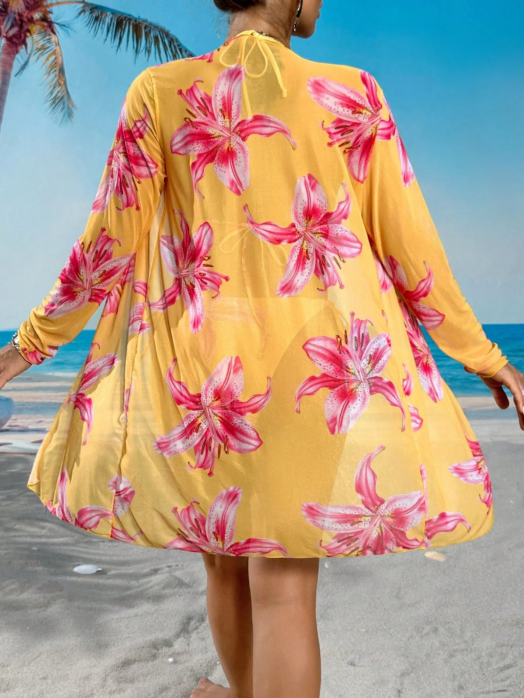 Swim Vcay Conjunto de biquíni malha impressão floral triângulo sutiã top & lado do laço bottom biquini & quimonos roupa de banho 3 peças
