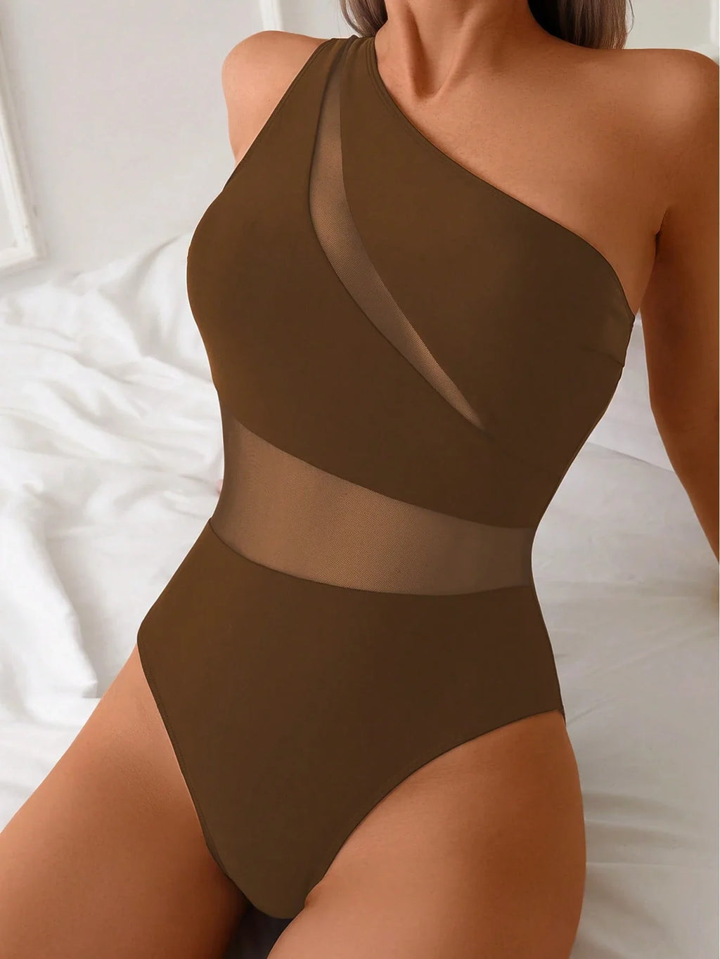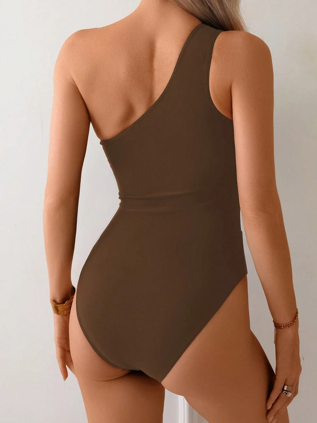 Peças ForradasSwim Lushoire 1 Peça Maiô Estilo Spring Break Feminino, Cor Sólida com Recortes em Tela, Assimétrico com Ombro Único e Costas Abertas, Casual e Elegante para Férias e Natação
