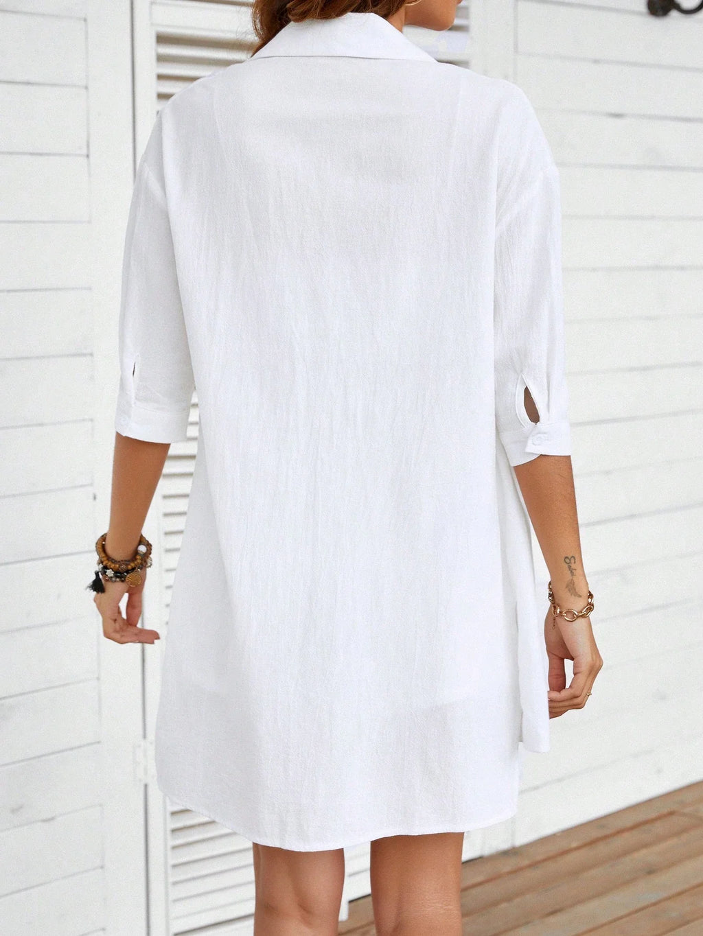 INAWLY Sólido Botão Frontal Ombro Caído Camiseta