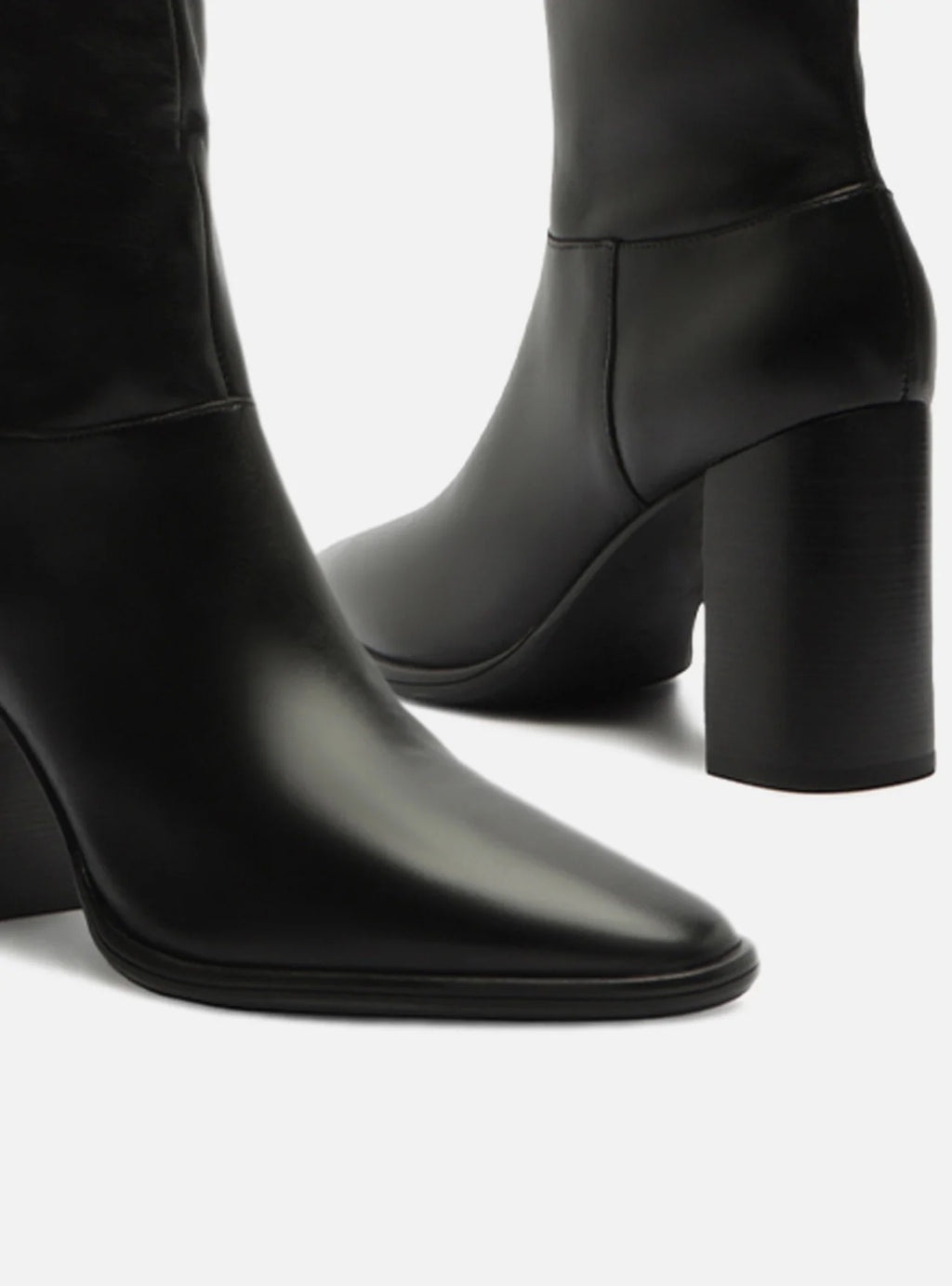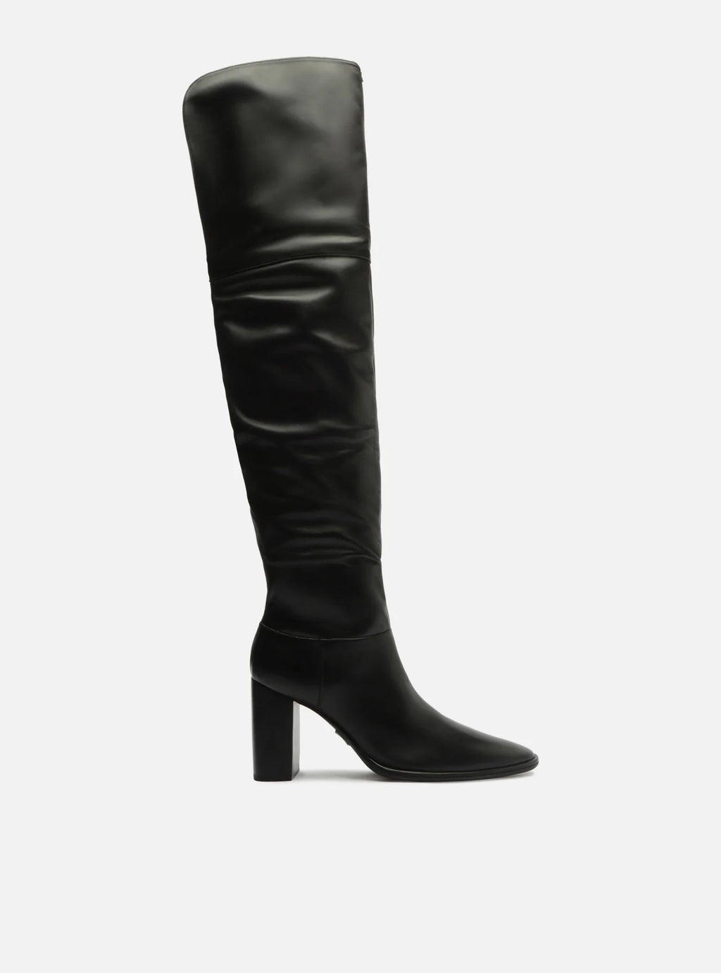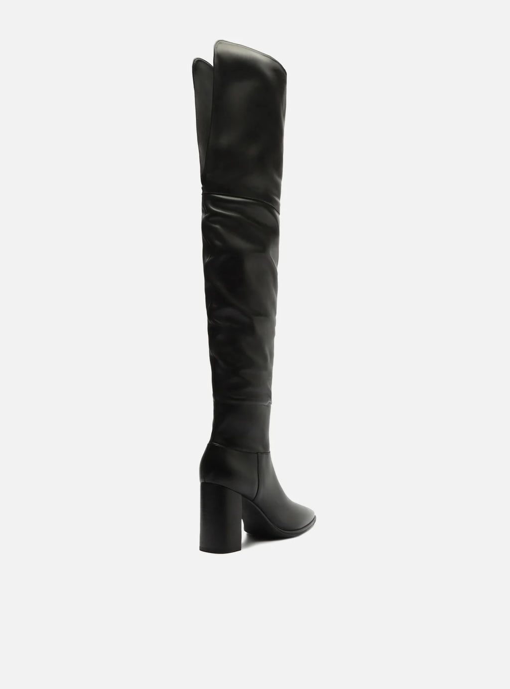 Bota feminina preta em couro. O sapato tem cano alto que cobre os joelhos, salto alto fino e ponta fina. Traz cano com efeito amassado e fecho em zíper na lateral interna do cano. Com recorte na parte superior e traseira do cano.