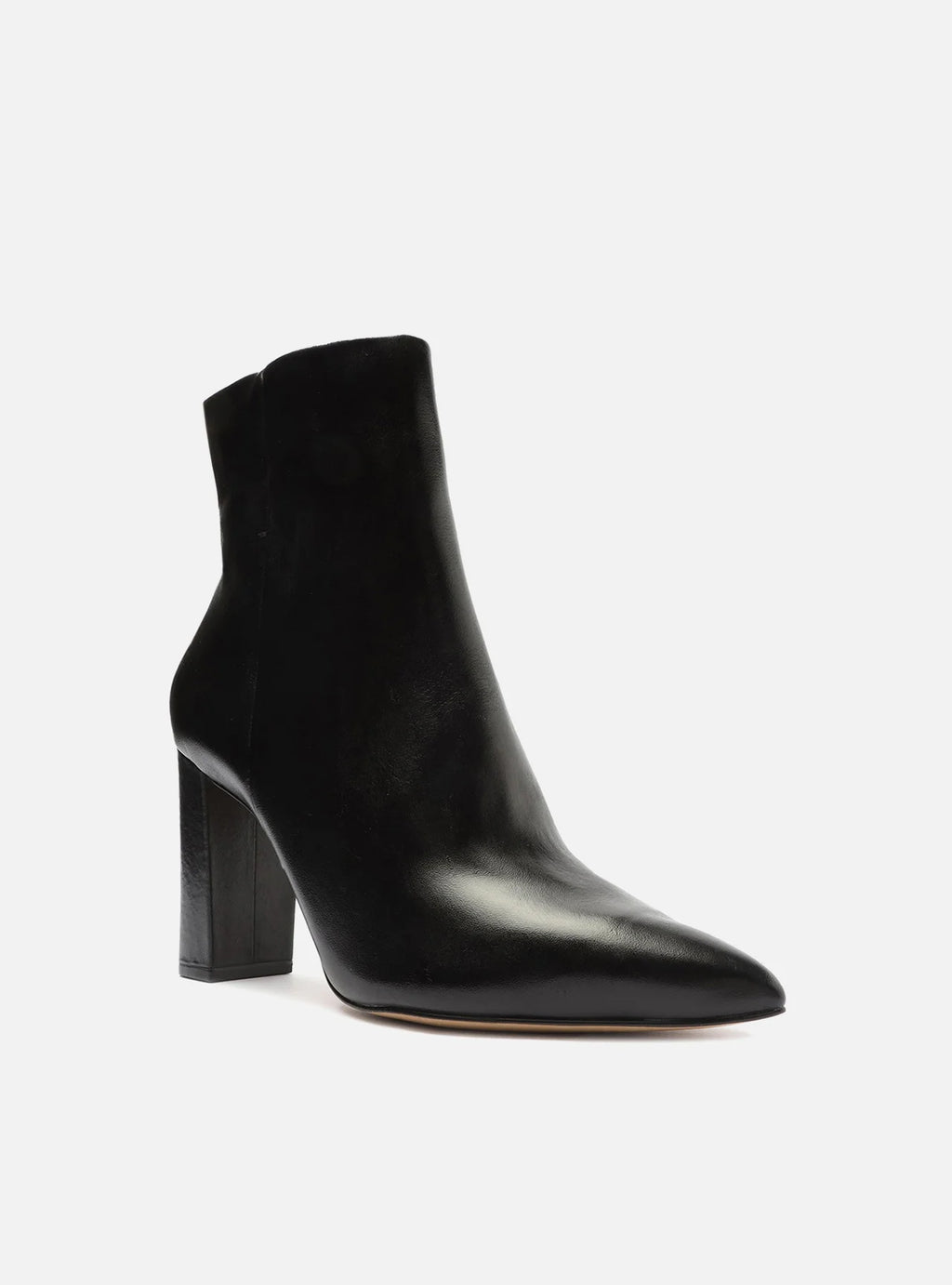 Descrição: Bota preta de couro. O modelo tem cano curto, salto alto bloco e bico fino. Traz cabedal ajustado ao pé e fecho em zíper na lateral interna do cano.