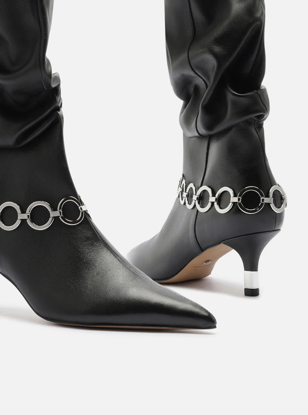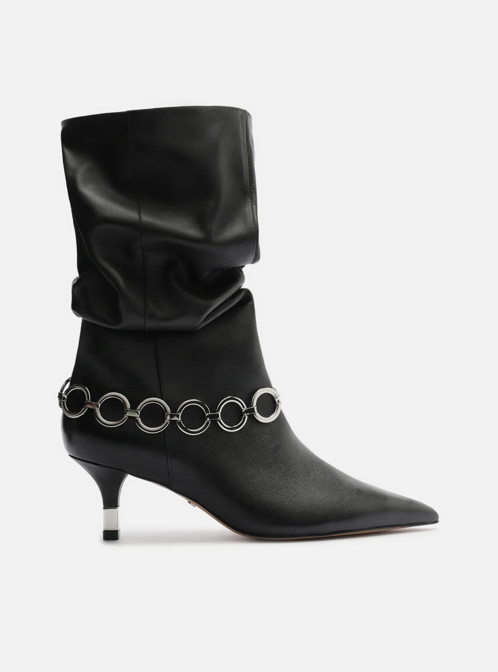Descrição: Bota preta de couro. O sapato tem cano médio com efeito amassado, salto médio fino com detalhe metálico e ponta fina. Traz cabedal ajustado ao pé e detalhe em enfeite de elos metálicos em torno do cano e removível. Não possui fechamento.
