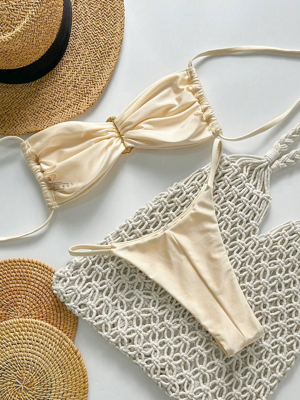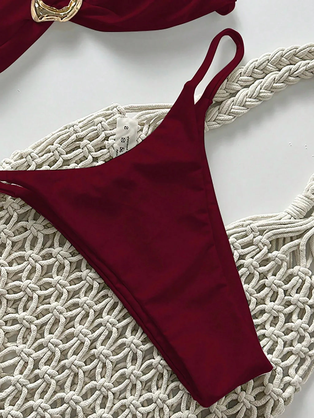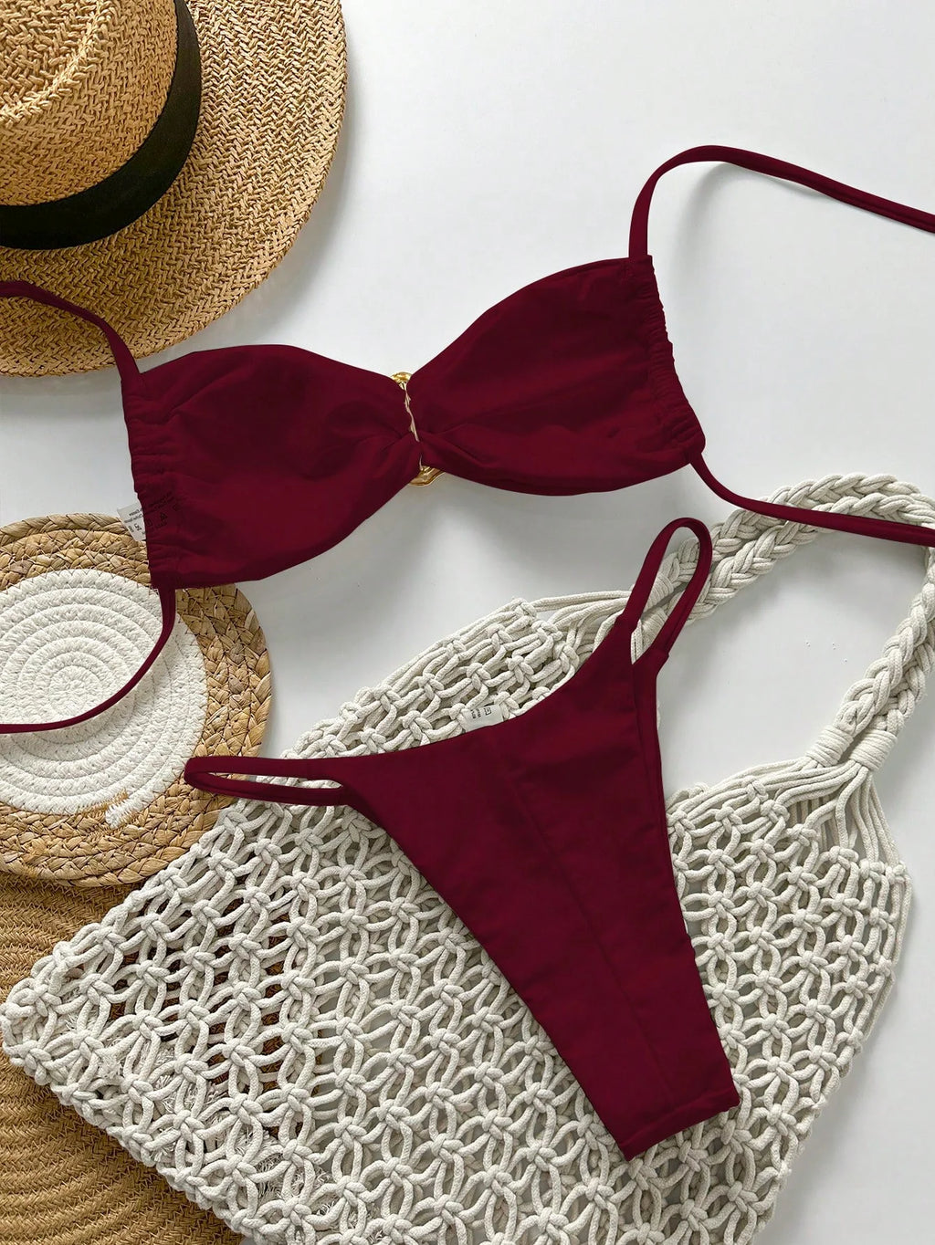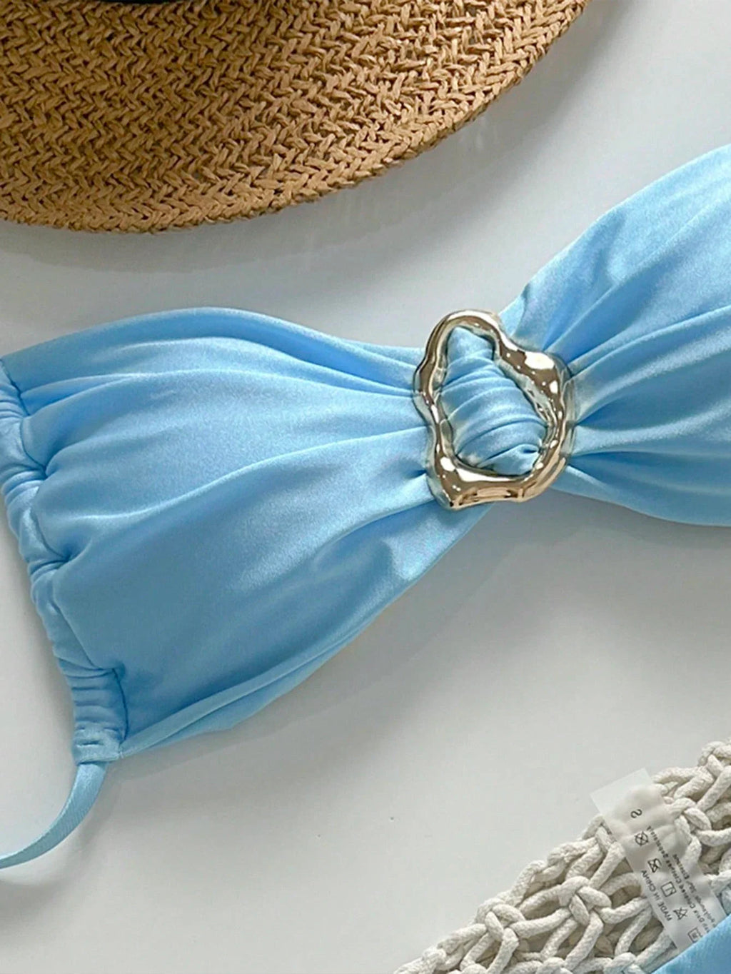 SHEIN Swim Conjunto de Maiô Bikini Feminino Strapless de Verão Solid Color com Amarração e Decoração Metálica, Sexy